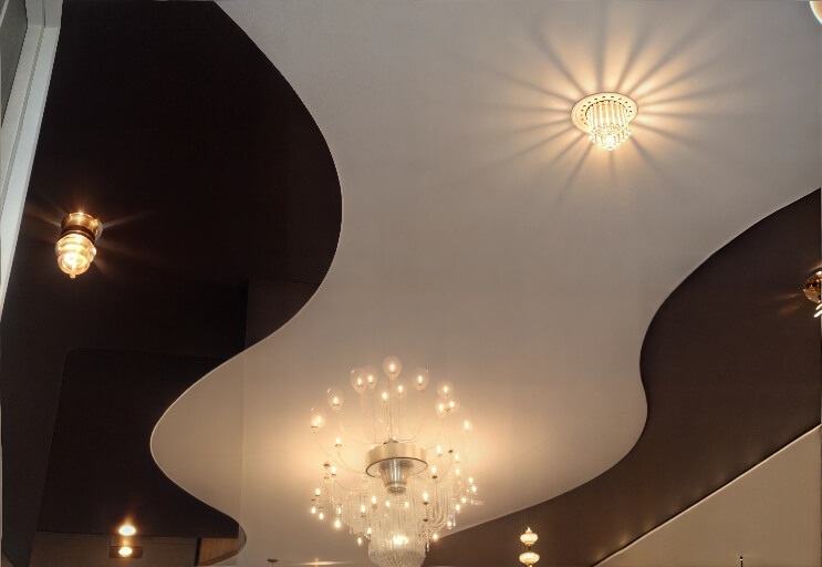 Освещение играет ключевую роль в восприятии двухцветного натяжного потолка. Правильно подобранные светильники могут подчеркнуть переходы между цветами, сделать их более мягкими или, наоборот, акцентировать внимание на контрастах. Встроенные светильники по периметру потолка создают мягкое, рассеянное освещение, которое помогает выделить центральную часть. Точечные светильники можно использовать для акцентирования определённых зон или создания эффектов, таких как звёздное небо. Светодиодные ленты, встроенные в потолок, позволяют создавать различные световые сценарии и менять настроение комнаты в зависимости от ситуации.