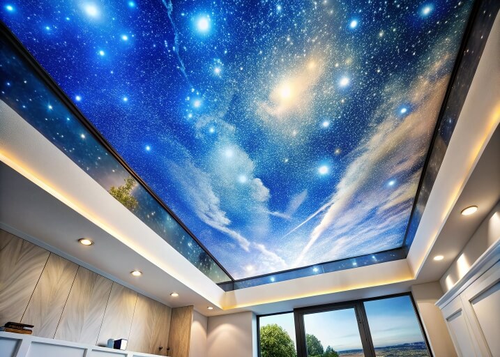 Интересный факт: такие потолки могут быть не только декоративными, но и функциональными. Например, они отлично подходят для детских комнат, создавая атмосферу сказки и волшебства. Дети обожают засыпать под светом звезд, чувствовать себя словно в космическом корабле, путешествующем по бескрайним просторам Вселенной. Это не только помогает им быстрее засыпать, но и развивает воображение и интерес к изучению космоса.